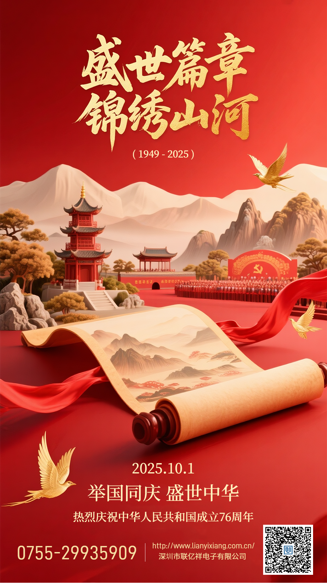 金秋送爽,丹桂飄香,在這滿載豐收喜悅與家國情懷的美好時節,我們迎來了中華人民共和國成立 75 周年與中秋佳節 “雙節同慶” 的幸福時刻。深圳市聯億祥電子有限公司向全體員工、合作伙伴及社會各界朋友,致以最誠摯的節日問候與最美好的祝福!